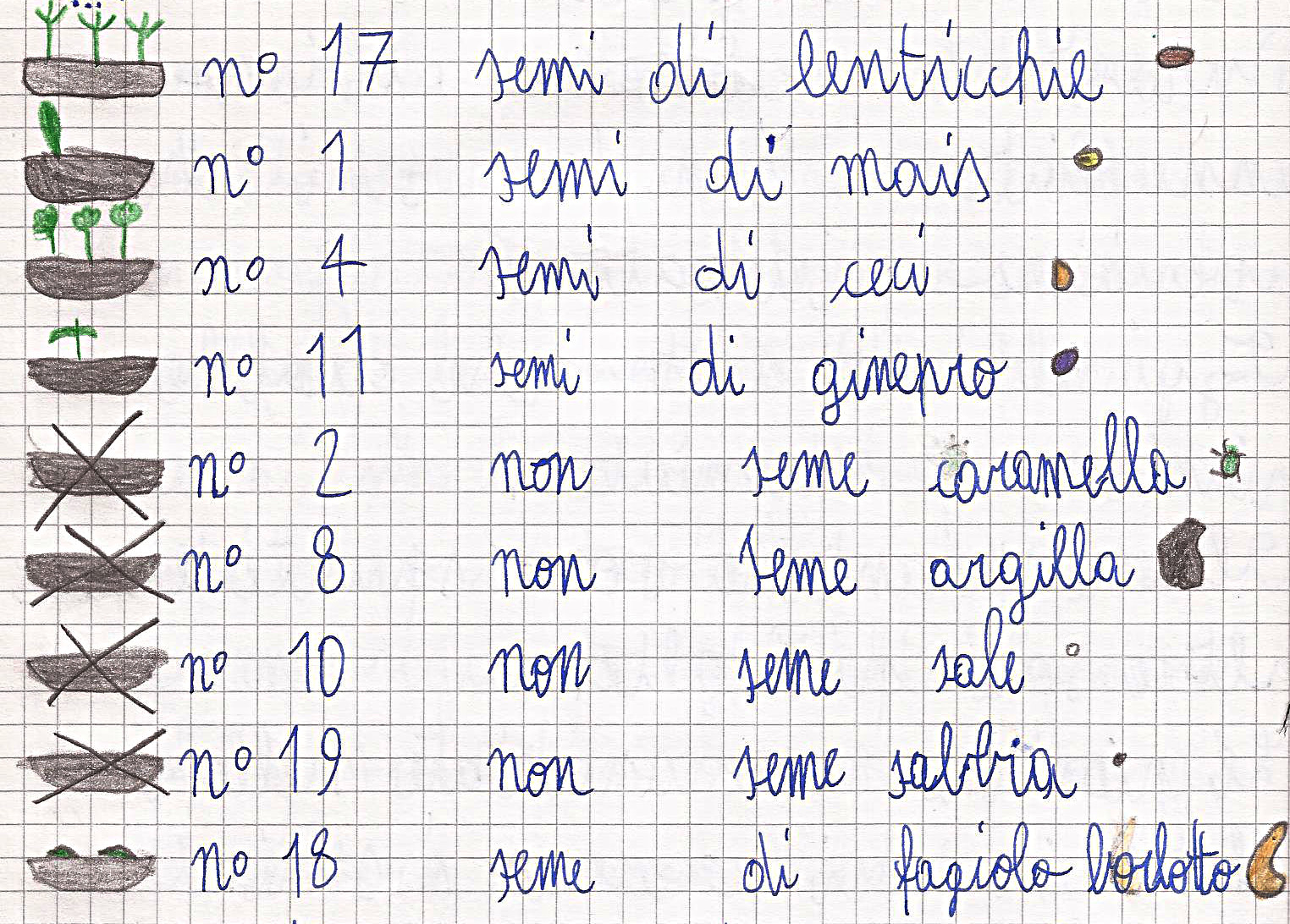Abbiamo anche imparato che i semi hanno bisogno di acqua tutti i giorni; alcuni ci mettono più tempo a far nascere le piantine; che i semi non sono tutti uguali ma sono divesi per grandezza, colore, forma ecc...