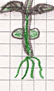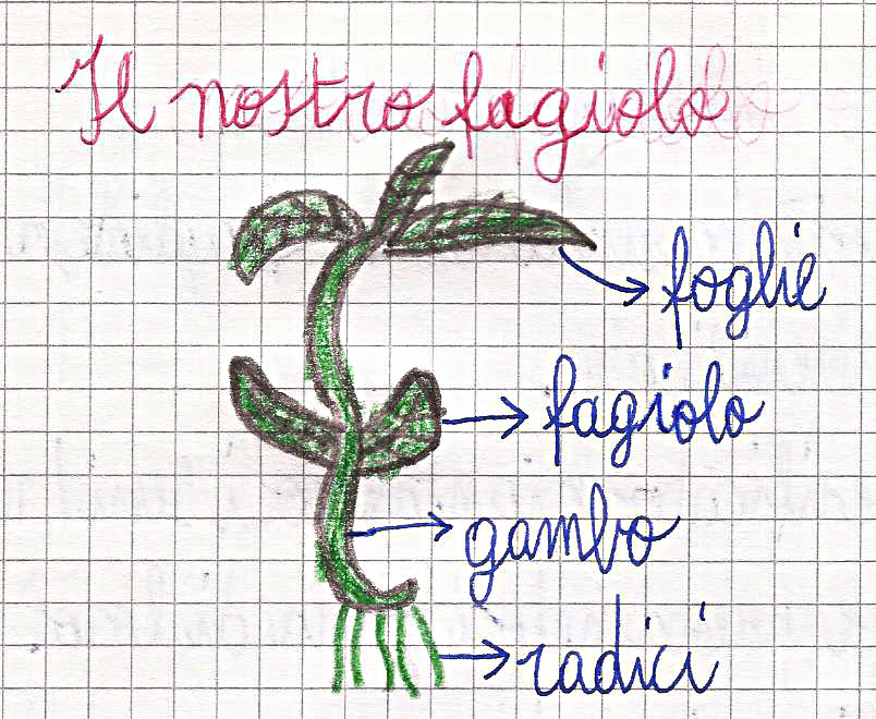 La pianta cresce, spuntano le foglie e le due parti del fagiolo si sono rinsecchite perché hanno dato nutrimento alla pianta.