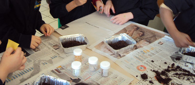 Mettiamo la terra nei contenitori e seminiamo.
