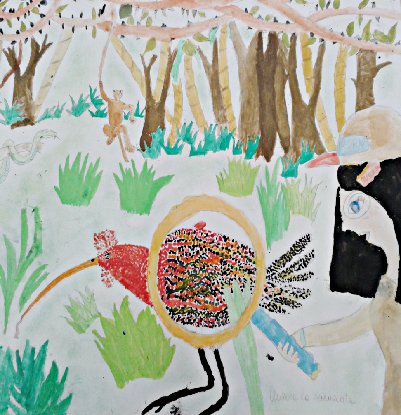 Ad un certo punto, si perse; mentre cercava di ritrovare la strada, sentì uno strano sibilo. Allora, in silenzio, senza far rumore, cercò tra la fitta vegetazione e scoprì un uccello che non aveva mai visto! Sembrava un mix tra l’ibis e il gallo cedrone.