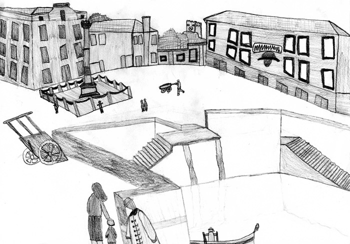Nel disegno si vede la piazza Barche, ora piazza XVII Ottobre,come doveva essere nei primi anni del '900. Si il porticiolo, punto di inizio del Canal Salso.